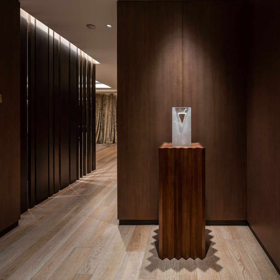 The Chairman Suite welcomes guests with a circular marble foyer—an expressive statement of craftsmanship and quiet grandeur that sets the tone for the suite’s elevated experience.